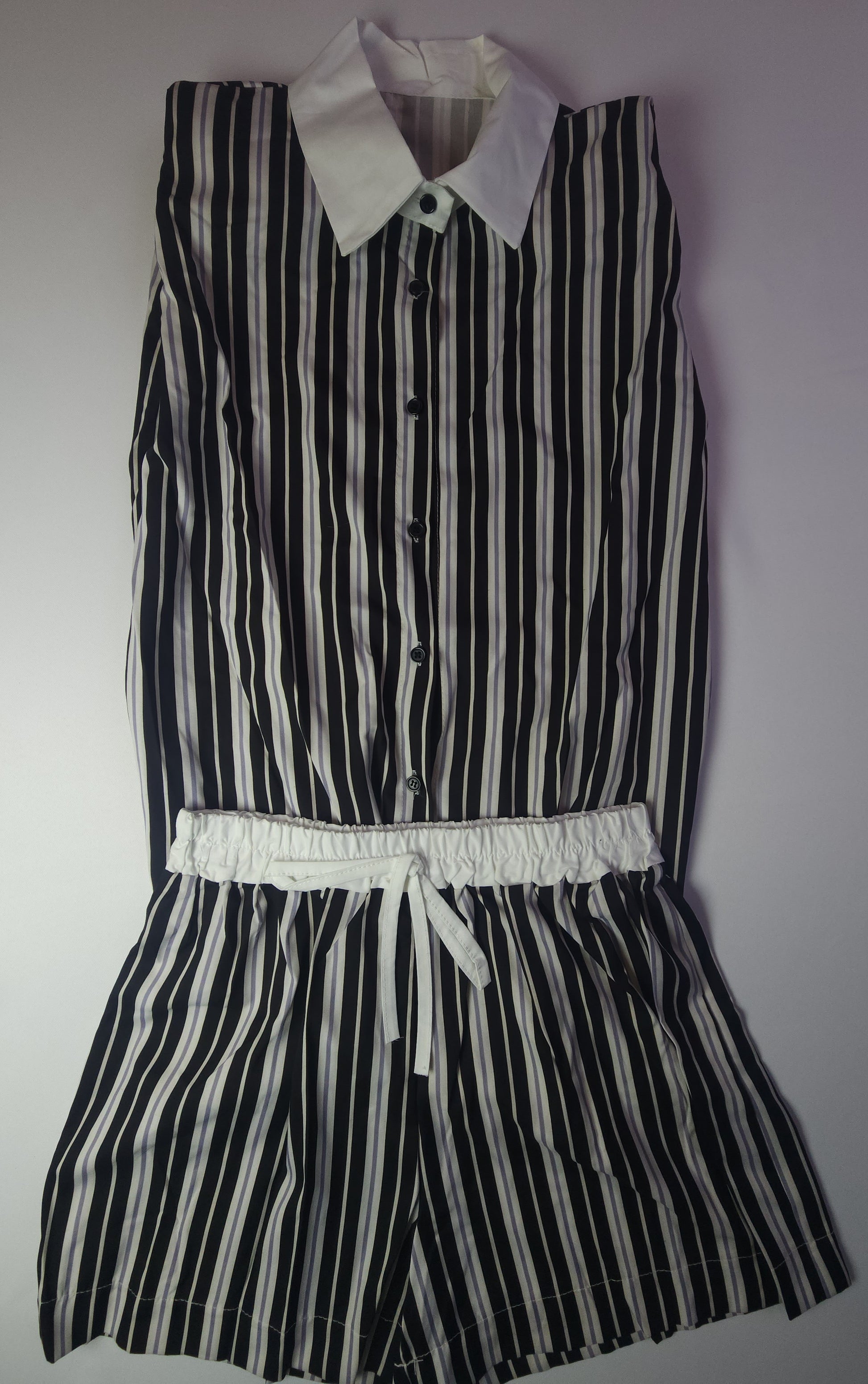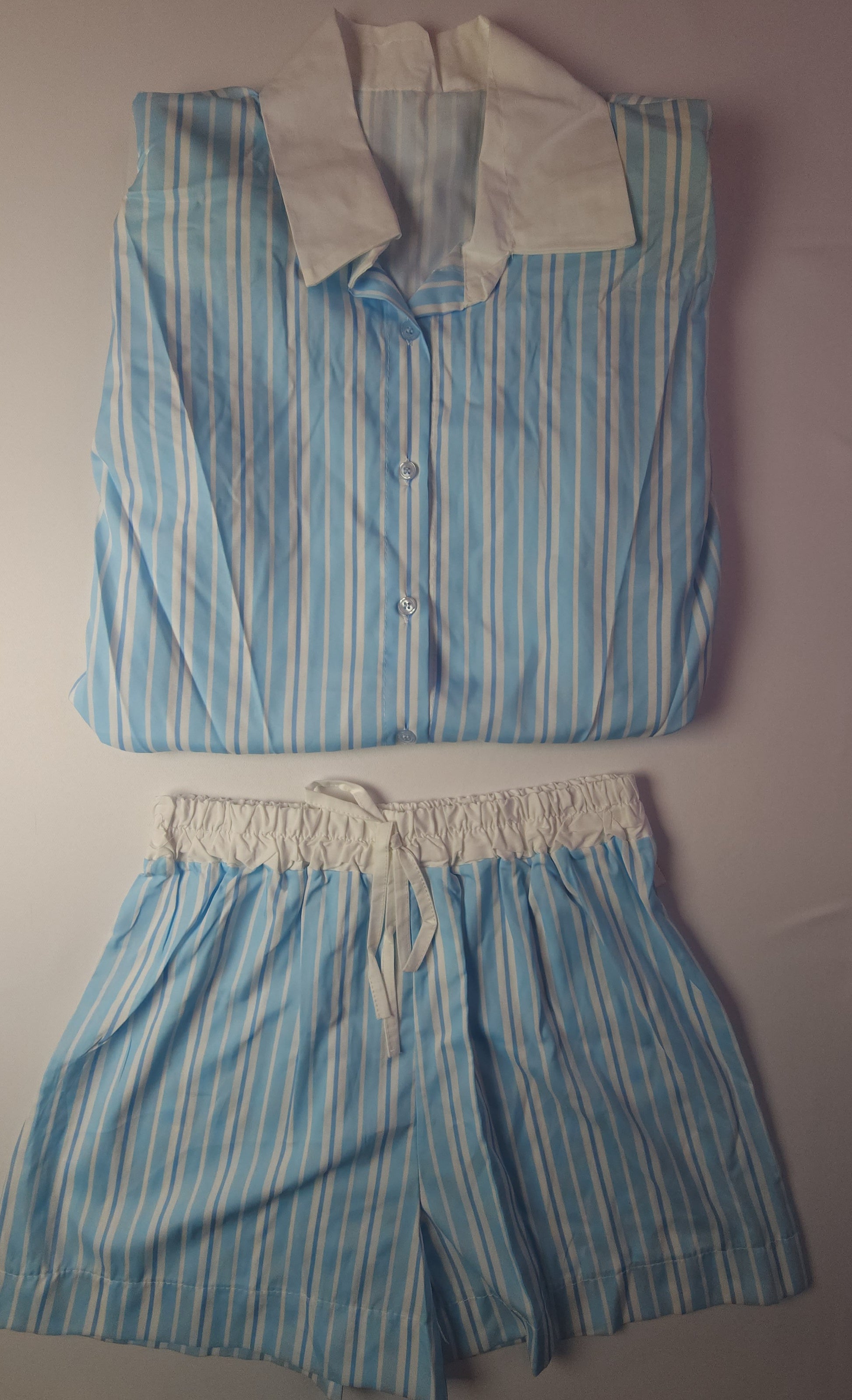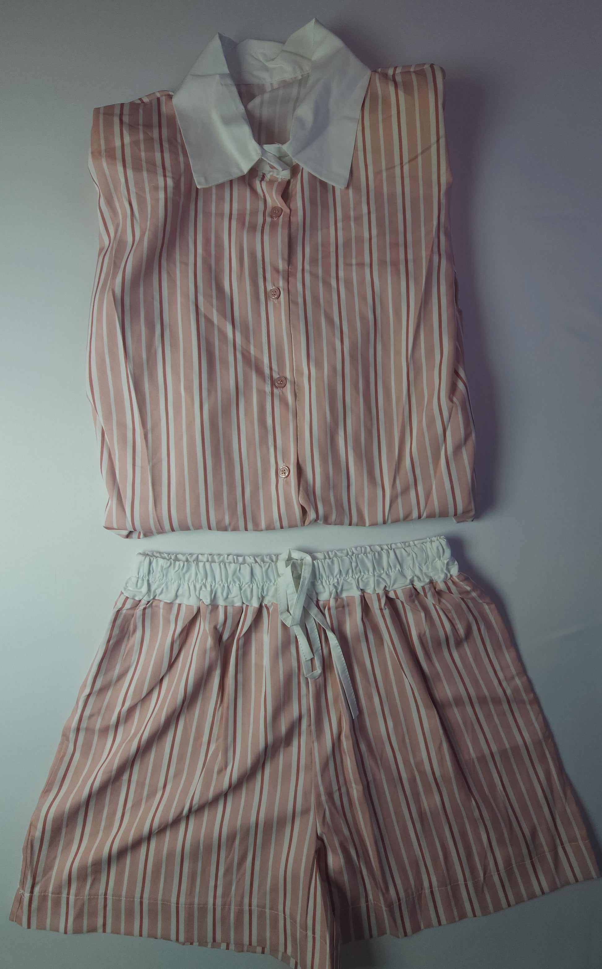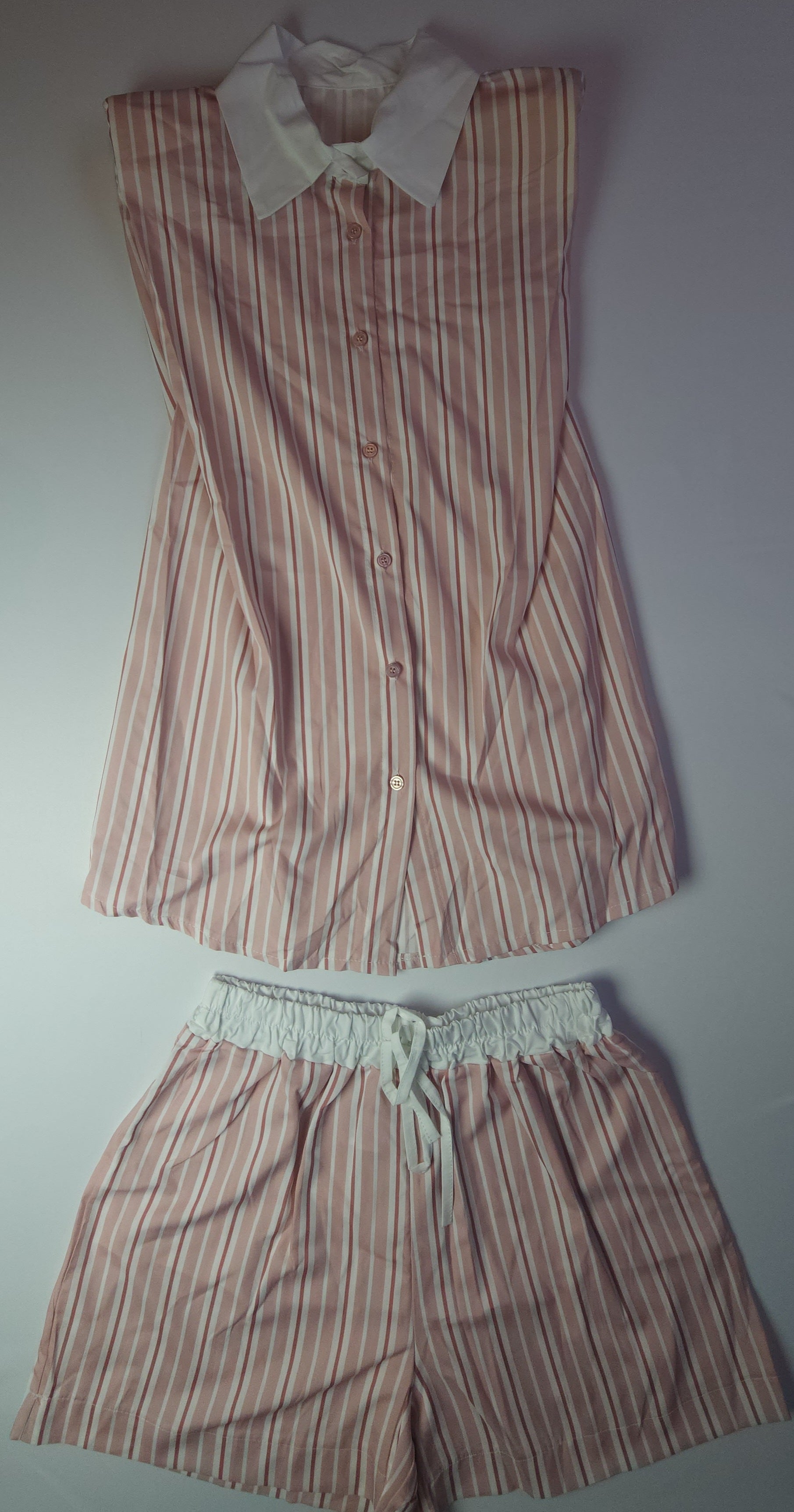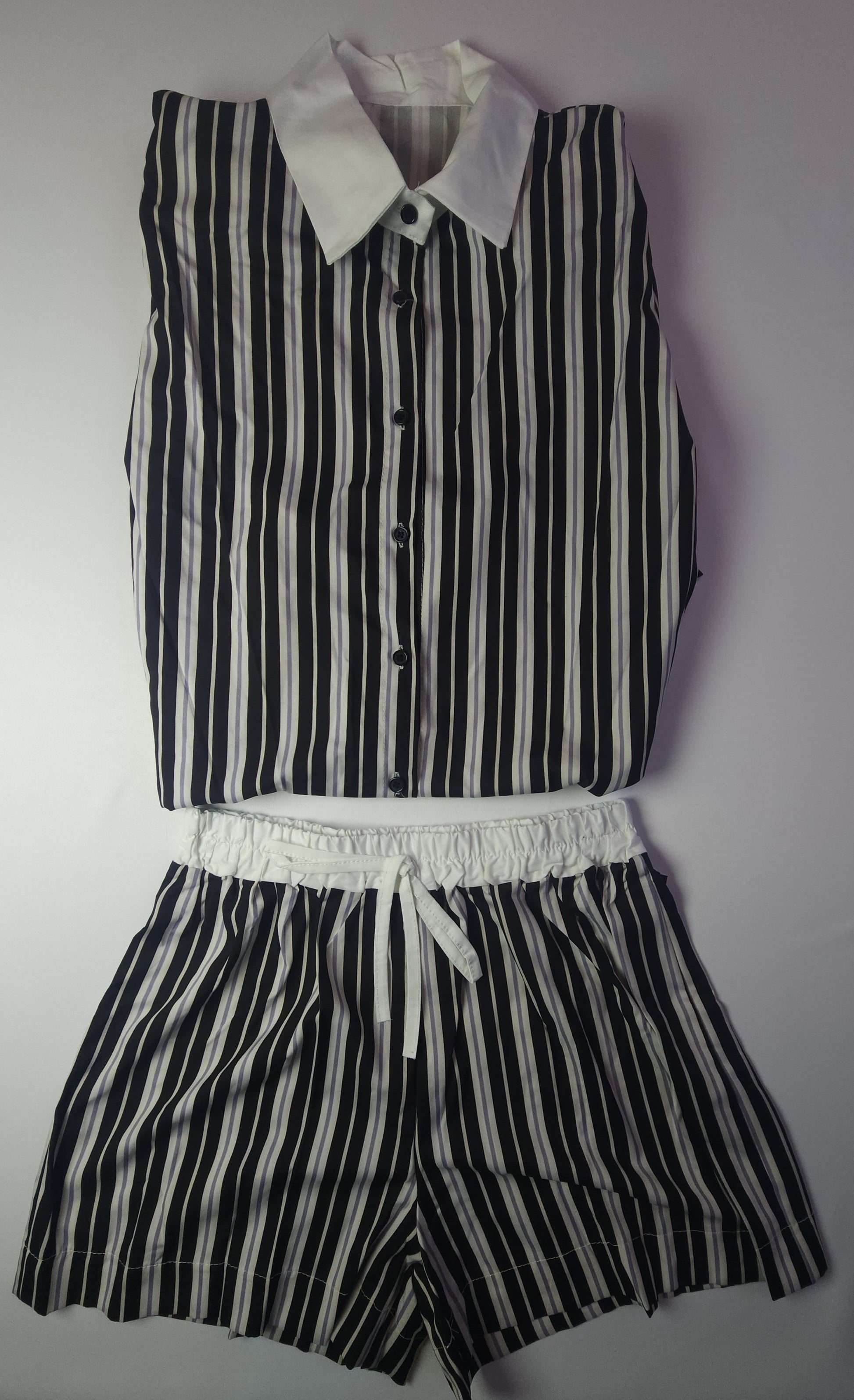 Comfortable striped short and top set with shoulder detail, fits small and medium, in 4 colors.